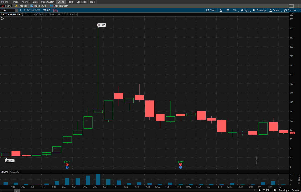 Помимо вновь провалившихся переговоров с Китаем и отчётов компаний, которые и увели индексы в минус, трейдеры вчера обсуждали новую покупку Tilray. Понятно, что пока сделки в секторе производителей каннабиса ничтожны по объёму в сравнении с крупными поглощениями, но эта компания давно уже интересует спекулянтов. Напомню, что последний хайп на Тилрей мы наблюдали в сентябре, когда прошла новость, что компания может поставлять своё сырьё для нового чудного рецепта кока-колы. Тогда акция, которая вышла на IPO в июле по 20$, взлетела до 300$, был отмечен и максимальный объём. Позже пена осела, цена опустилась уже до 70$, и пока на недельных и дневных ТФ мы видим нисходящий тренд. Тем не менее, с момента размещения коноплеводы уже принесли своим инвесторам более 200%. Вчера стало известно, что Тилрей за $35млн (15$ млн кеша+$20 млн. своих акций) купит Natura Naturals Holdings Inc. (“Natura”), т.е. все выпущенные акции этого лицензированного культиватора каннабиса. Взамен компания получит