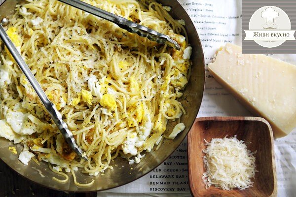 Вот быстрая и вкусная паста, когда у вас мало времени. Все, что вам нужно, это коробка спагетти, четыре яйца, оливковое масло и чеснок (Пармезан является вкусным, но необязательно, дополнение). Шаг: 1 Довести до кипения кастрюлю с соленой водой. И начните варить макаронные изделия когда вода закипит. Шаг: 2 Смешайте чеснок и 4 столовые ложки масла в небольшой сковороде на среднем огне. Чеснок необходимо отжимать для того чтобы выпустить его аромат; он должен едва покрасить на обеих сторонах. Вынуть чеснок и добавить оставшееся масло. Шаг: 3 Аккуратно обжарьте яйца в масле, пока белки не станут почти готовыми, а желтки еще совсем сырые. Слейте макароны, яйца добавить к ним, (Яйца закончат вариться в жаре макаронных изделий.) Приправить по вкусу, и подавать сразу, с сыром, если хотите. ВЫХОД: 2 или 3 порции ВРЕМЯ: 20 минут ИНГРЕДИЕНТЫ: Соль (по вкусу) 200 грам спагетти 6 столовых ложки оливкового масло 2 больших зубчика чеснока, очищенный 4 яйца Свежемолотый черный перец Тертого