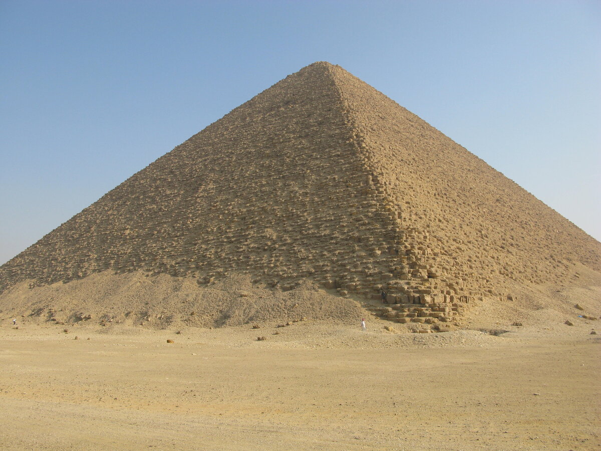 Знакомство с наследием загадочной древней цивилизации, оставившей все далее рассматриваемые чудеса, начнем с Красной пирамиды. Высота - чуть больше 100 метров. Размер основания - 220 на 220 метров. Угол наклона граней - около 45 градусов. Сложена из известняка. И к тому же абсолютно точно сориентирована по сторонам света. Пирамида совершенно прекрасна. Гармоничное, аккуратное сооружение, симметричными правильными формами скрадывающее свой исполинский на самом деле размер. Внимательный читатель спросит: А чего она не красная? И будет прав. Эта пирамида получила такое название потому, что при определенном положении солнца она вроде бы отсвечивает красным цветом . Вот на этой фотке можно наблюдать более или менее красноватый ее оттенок. Он получается из-за характерного вида известняковых блоков, из которого сложена пирамида. Легко заметить, что сами блоки пирамиды за свою долгую жизнь явно видали виды. Они очень рыхлые и ветхие. Можно буквально руками отламывать от них куски. Сколь