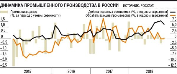 Промпроизводство-2018 выросло на 2,9%, что близко к официальному прогнозу. Драйверы: сырьевые отрасли и продовольствие. Экономисты не видят ни возврата к рецессионно-стагнационному сценарию, ни сигналов ускорения: «Впрочем, если термин "стагнация" заменить "стабилизацией", наполовину пустой стакан станет наполовину полным» (подробнее, ~3 мин).