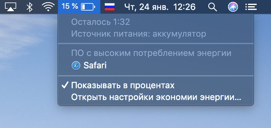 Начиная с macOS Sierra стандартный индикатор не показывает прогноз оставшегося времени работы от аккумулятора. Подобной функциональностью обладают многие сторонние приложения, но сегодня я покажу, как вернуть стандартный системный индикатор. Для начала, нужно загрузиться в режим recovery, чтобы отключить SIP, — систему, защищающую системные файлы от изменения или повреждения. Для этого выключаем мак, затем сразу после нажатия кнопки включения зажимаем комбинацию cmd + R. После загрузки в строке меню выбираем Утилиты → Терминал. В окне терминала прописываем команду: csrutil disable; reboot Система перезагрузится в обычный режим. Теперь открываем Finder, в строке меню выбираем Переход → Переход к папке... и прописываем путь: /System/Library/CoreServices/Menu Extras/ В открывшейся папке нас интересует файл Battery.menu. Его можно удалить, но я рекомендую его переименовать, например, в Battery_old.menu, чтобы в дальнейшем его можно было восстановить. А оригинальный файл заменяем на Batte
