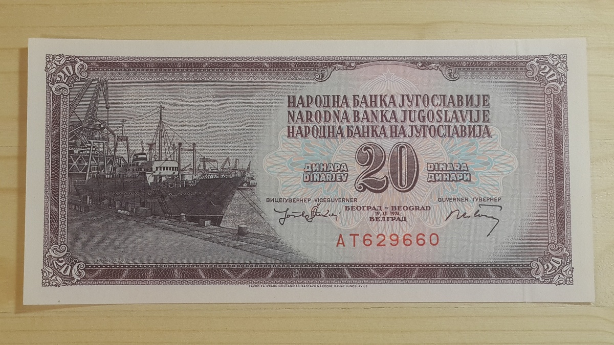 19 декабря 1974 года Народный банк Югославии начинает выпуск банкноты номиналом 20 динаров. Данная банкнота выпускалась с 1974 по 1981 год. Материал - бумага. Печатались в типографии Института Производства банкнот и монет – Топчидер (Topcider), Белград . Печать выполнена в фиолетовом цвете, водяные знаки отсутствуют . На аверсе банкноты изображен порт с кораблем у пристани. Правее надпись "Народный банк Югославии" на трех языках,обозначение номинала "20 динар" ,ниже серия и подписи Управляющего и Кассира. На реверсе - числовое обозначение номинала банкноты "20", национальный орнамент. Легенда " Народна Банка Jугославиjе. Narodna Banka Jugoslavije. Народна Банка на Jугославиjа. Пет Динара. Pet Dinarjev. Pet Dinara. Пет Динари. Socijalisticka Federativna Republika Jugoslavija. Социjaлистичка Федеративна Република Jугославиjа. Socialisticna Federativna Republika Jugoslavija. " Так же 19 декабря 1974 года ,вместе с 20 динарами, в обращение выпускается банкнота номиналом 1000 динаров.
