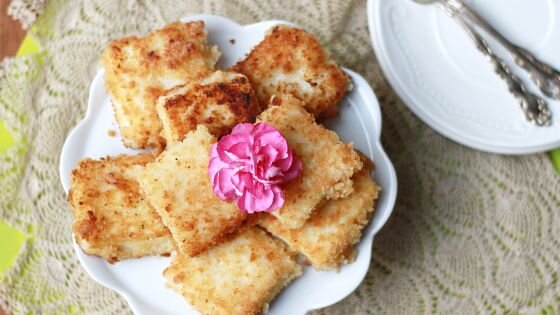 Вкусный и необычный рецепт запеканки во фритюре.Самые простые ингредиенты,но очень вкусное блюдо.Такого вы еще не пробовали... Нам понадобиться: 1) 1⁄2 стакана сахарного песка; 2) 1⁄2 стакана кукурузного крахмала; 3) 1⁄4 чайная ложка мускатного ореха; 4) 3 стакана молока; 5) 1 столовая ложка сливочного масла или 1 столовая ложка маргарина; 6) 1⁄4 чайной ложки тертой лимонной цедры; 7) 2 яйца; 8) Хлебные крошки 3⁄4 чашки ; 9) Растительное масло; 10) 1⁄3 стакана сахарной пудры (по желанию). Приготовление: Первое,смешайте сахар, кукурузный крахмал и мускатный орех в 3-х литровой кастрюле. Второе,добавляем молоко. Третье,подогреваем до кипения на среднем огне, постоянно помешивая. Четвертое,кипятим и помешиваем 1 минуту, после снимаем с огня. Пятое,добавляем масло и цедру лимона. Шестое,равномерно распределяем в квадратной форме для выпечки. Седьмое,кладем в холодильник на 3 часа до того, как схватиться заготовка. Восьмое,нарезаем заварной крем на квадраты, используя нож,заранее намочив е