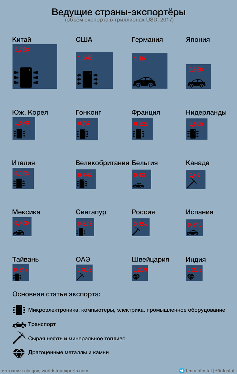 Объём мирового экспорта в 2017 году составил около 13,8% от ВВП планеты или 17,5 триллионов американских долларов, конечно, экспортный рынок давно поделён и почти 72% от этой величины приходится всего на 20 участников, но всё же довольно интересно изучить составляющие их успеха, а среди крупных игроков могут оказаться и совсем неочевидные страны.