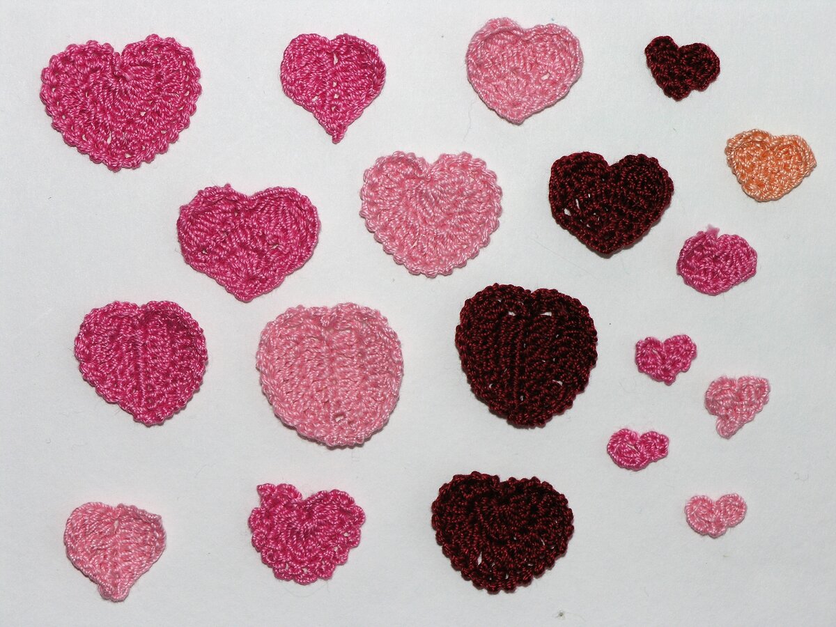 В поисках вязаных сердец нашла в интернете много идей, из них маленьких всего два-три. Поняла принцип вязания и сделала по-своему. Сердечки нужны для оформления открыток к Дню влюблённых, пригодятся они для 8 Марта и Дня рождения. Для работы взяла хлопок, на полотне из которого хорошо виден рисунок столбиков. Схемы состоят всего из 2-3 рядов. Поэтому подойдёт толстая и фактурная пряжа. Экспериментируйте. Условные обозначения Вп – воздушная петля Сс – соединительный столбик Сбн – столбик без накида Ссн – столбик с накидом Псн – полустолбик с накидом Сс2н – столбик с двумя накидами 1 способ (самый красивый) 1 ряд - в кольцо амигуруми 3 вп, 10 столбиков с накидом, 3 вп, сс 2 ряд – на цепочке из 3-х вп сс, сбн, псн; 5 прибавок (по 2 ссн в каждую петлю предыдущего ряда), 2 сс2н, 5 прибавок ссн; на цепочке из 3-х вп псн, сбн, сс Обвязать рачьим шагом 2 способ (важно правильно обвязать, чтобы обозначился контур) 1 ряд - 9 вп. Во вторую от крючка петлю сс, далее 1 сбн, 1 ппс, 4 ссн; в перву