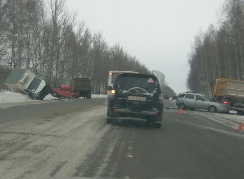 Серьезная авария произошла на въезде в Ярославль около часа назад. На этих кадрах очевидца видно, что участниками ДТП стали сразу несколько автомобилей. Одна легковушка сильно повреждена. «Газель» повисла на сугробе. Еще один автомобиль въехал в грузовик. Информации о происшествии и пострадавших пока нет.
