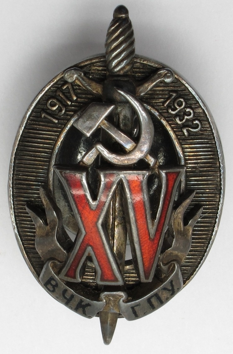 Знак "Почетный работник ВЧК–ГПУ" XV годовщины был учрежден приказом ОГПУ № 1087 от 23 ноября 1932 г. Как и предыдущий знак, он присваивался за "выдающиеся заслуги", но при этом стаж службы претендента в органах или в войсках ОГПУ должен был быть не меньше десяти лет. (Впрочем, этот критерий строго не соблюдался, и в последующие годы почетный знак порой вручался и партийным выдвиженцам, недавно попавшим в “органы”. Например, в 1938 г. этим знаком были награждены В.Е. Цесарский и И.И. Шапиро.) Разумеется, сохранялась, и это оговаривалось в приказе ОГПУ от 23 ноября 1932 г., вся система привилегий для кавалеров нового знака. Правда, со временем эти привилегии постепенно отменяли. Так, в 1933 г. была отменена ежемесячная 30-рублевая надбавка к зарплате, в 1935 г. – льготное исчисление пенсии и право обязательного перевода на пенсию по линии ОГПУ, в 1937 г. – право ношения чекистской формы после увольнения, а затем и право беспрепятственного входа во все здания органов госбезопасности. В и
