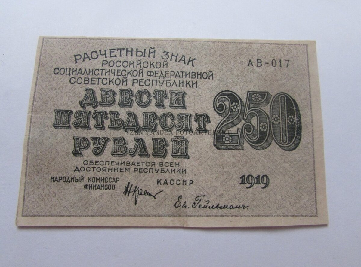 Ликвидировал еще одну дырку в коллекции - купил купюру в 250 рублей 1919 года. Можно сойти с ума - ей же уже 100 лет! Кажется так недавно наша страна была советской, а первым деньгам уже исполнился век. Необычный номинал для сегодняшнего времени. Не знаю, чем руководствовались при создании, наверное тем же, чем сегодня объясняют введение купюры в 200 рублей. Вот так выглядит эта бумажная денежка: Аверс представлен указанием номинала прописью и цифрами, полным наименованием банкноты, подписями наркома финансов и кассира, двухзначной серий и трехзначным номером, годом 1919. Также приводится информация об обеспечении. На оборотной стороне изображен герб РСФСР, указан номинал цифрой и прописью на международных языках. Интересное дело - основной фон оформления этой банкноты больше похож на зеленый, хотя во многих источниках он заявлен как розовый (а Википедия вообще пишет, что фиолетовый). Почему такое явление имеет место? У меня есть версия - может быть деньги 1919 года печатались разными