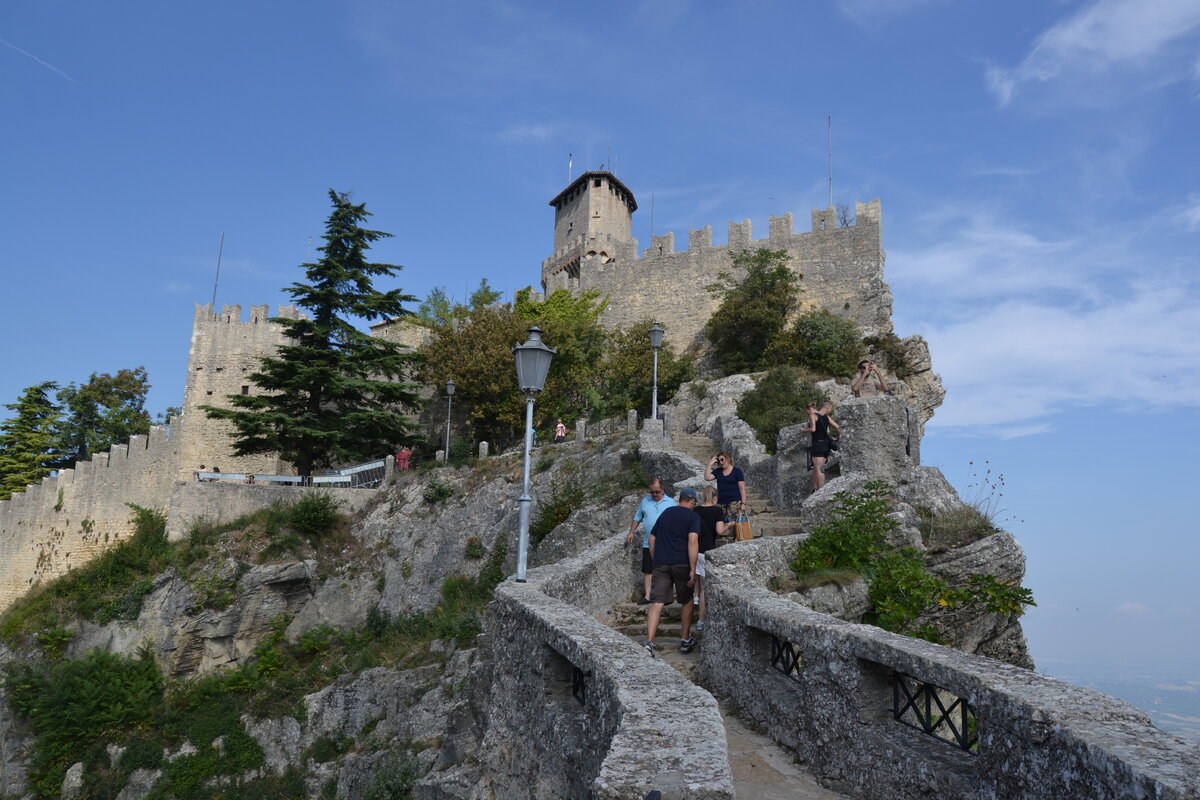 Сан-Марино – маленькое независимое государство, окруженное Италией. Оно у всех на слуху не только из-за красивой природы, достопримечательностей, но и шоппинга. Карликовое государство находится в 30 минутах езды от г. Римини, не входит в шенген зону, но это не влияет никак на пересечение границы. Аэропорт обслуживания также находится в Римини. Я настроила себя на то, что получу от поездки сразу 3 удовольствия – погуляю по стране, осмотрю достопримечательности, а потом устрою шоппинг. В этой стране практически одна основная дорога, ведущая на самую вершину, где расположились три крепости. Эти крепости и есть основные достопримечательности страны. Кстати, по официальным данным это самое старое государство в Европе. Больше можно узнать тут. Страна названа в честь святого Марина, который в IV веке нашей эры нашел пристанище в пещере, а потом построил келью. Крепости Гуаита, Честе и Монтале соединены между собой горной грядой. Если вы готовы пешком обойти все башни, то наденьте удобную