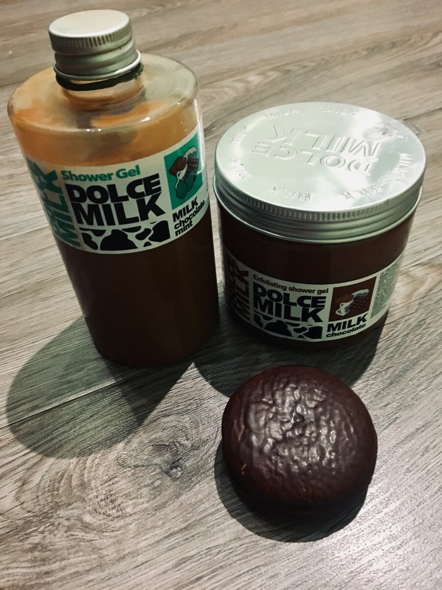 Я маньяк по теме гелей для душа. На полочках в ванной используются одновременно не менее пятнадцати и в два раза больше ждут своей очереди в закромах. Но есть у меня два любимчика, которые я с упорным постоянством покупаю уже в течение 7 лет. Знакомьтесь - Dolce milk chocolate mint. Гель российского производства, гордая надпись на упаковке paraben free вызывает, конечно, сомнения, но даже и если и есть в этом геле парабены, то ничего страшного - не есть же мне его. А вот тут самый интересный момент: цвет геля для душа уже настраивает попробовать что-нибудь такое обволакивающе-шоколадное, но вот при открытии очень крутой металлической крышечки.... Это реальный крышеснос. У меня было много шоколадных гелей для душа, но этот......мне кажется он пахнет даже шоколаднее шоколада. Это запах шоколадного бисквита только из духовки, такого пористого и влажного и на который сверху положили пару листочков мяты для красоты. Мята не перебивает шоколад, а делает его таким свежим, не приторно-сладк