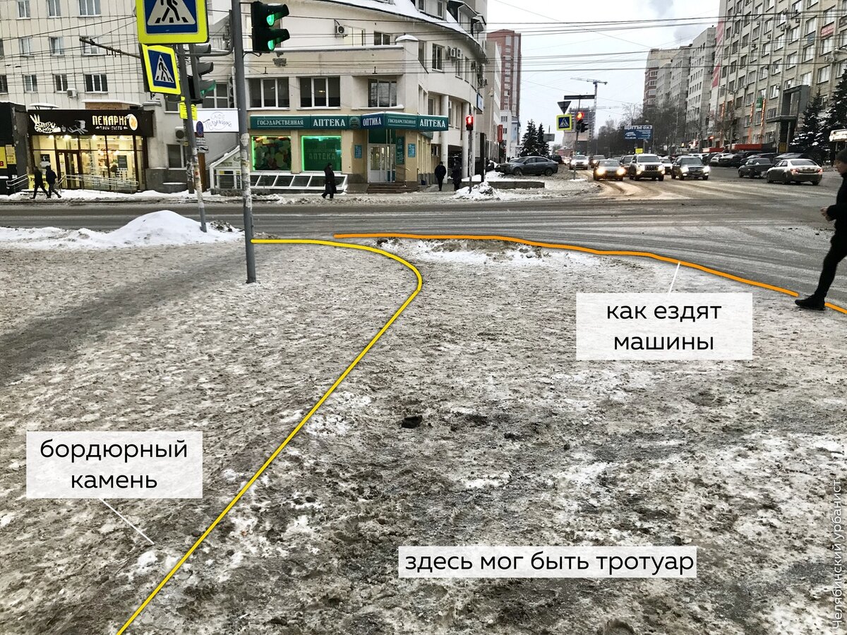 Чтобы по городу не мчались автомобили, делают успокоение трафика: сужают полосы, делают островки и шиканы. Обычно, когда урбанисты предлагают местами сократить дорожное полотно, у непросвещённых горожан начинается истерика: «вы что, хотите, чтобы всё встало в пробку?» Лучшим аргументом в подобной дискуссии будут фотографии обсуждаемого участка в зимний период — автомобилисты своей траекторией голосуют, сколько места им действительно необходимо. Каждый неиспользуемый метр дороги нужно забирать под тротуар, озеленение или техническую зону. Почему это важно: