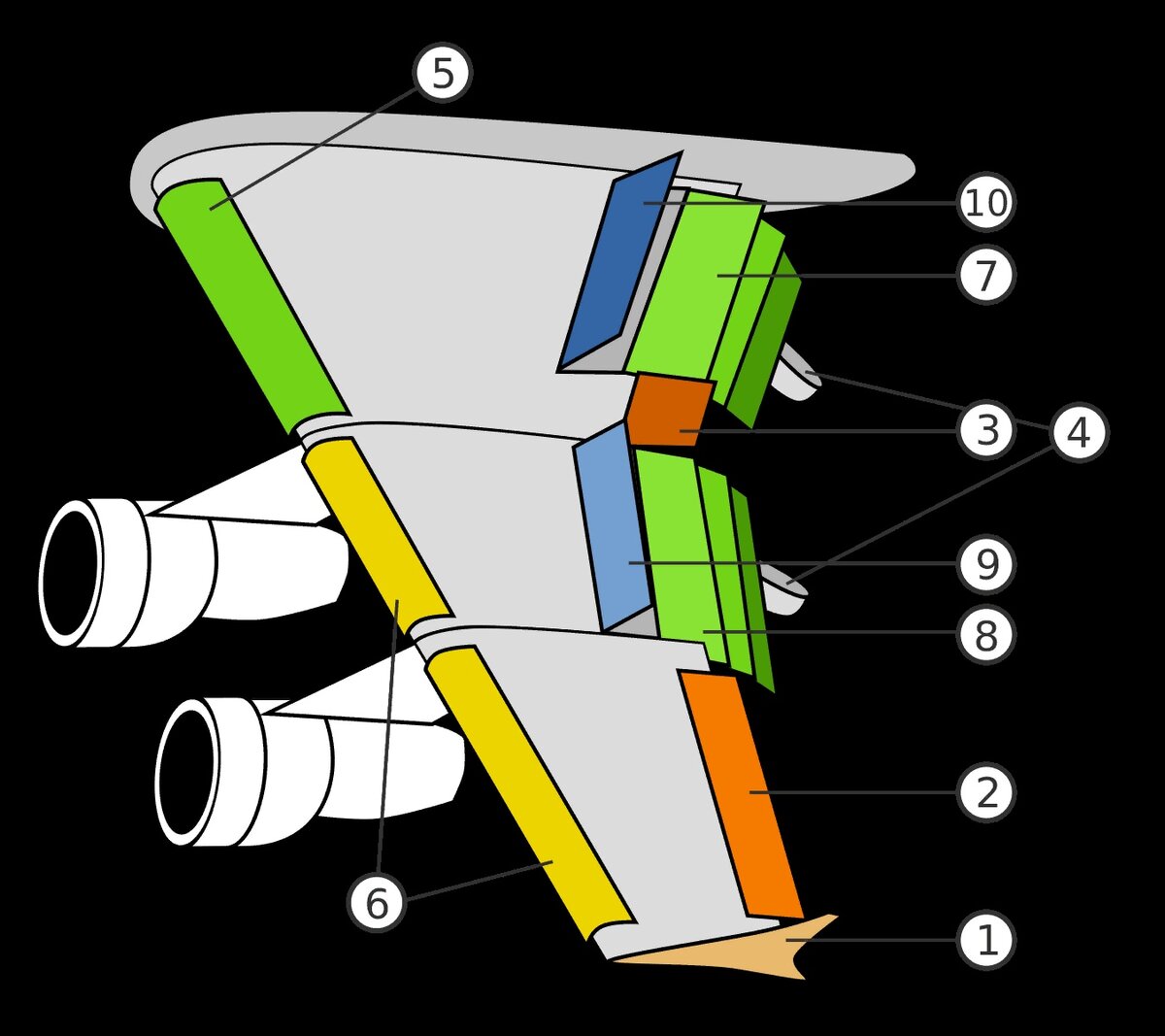 Крыло в авиационной технике - поверхность для создания подъёмной силы. В общем случае крыло самолета состоит из центропланной части, консолей(левой и правой) и механизации крыла. Основные части механизации крыла: