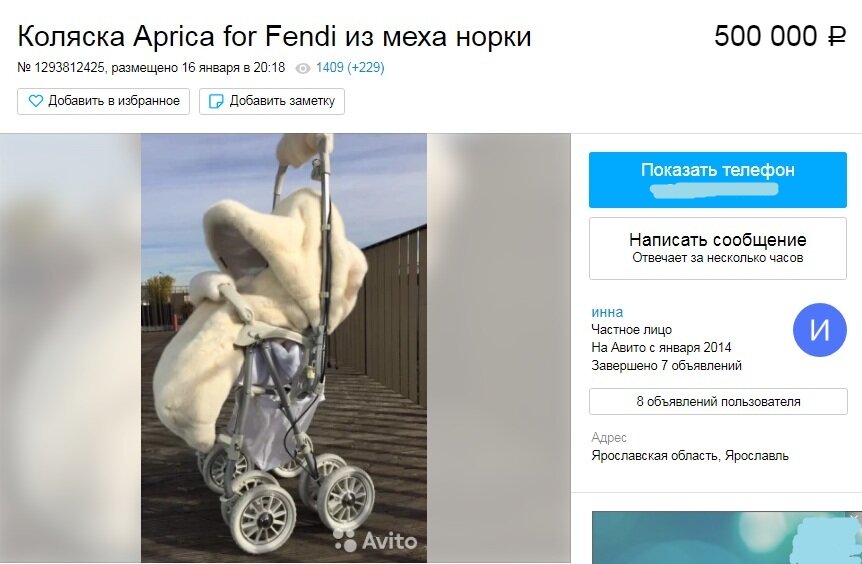 На одном из сайтов бесплатных объявлений появилось предложение о продаже детской коляски. От всех остальных его отличает стоимость: за прогулочную коляску продавец просит 500 000 рублей. - Новая коляска с мехом белой норки. Идеальна для суровой, снежной зимы. Анатомическая форма лежака, ортопедический матрасик с регулируемой вентиляцией. Меховой мешок-вставка для ножек. Идеальная, красивая, удобная коляска. Первоначальная цена 13000 $, - сообщает продавец. Фирма производитель коляски находится в Японии. И цены на модельный ряд, представленный в России, достаточно высоки. Самая дешевая из колясок стоит 17 000 рублей. Предлагаемая в объявлении эксклюзивная модель стоит так дорого из-за отделки белой норкой.