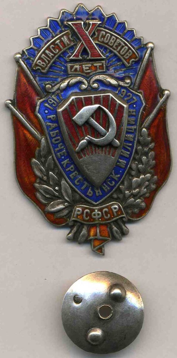В 1927 году появился первый наградной юбилейный знак советской милиции «X лет РКМ» (1917–1927). Он был учреждён 15 октября 1927 года Центральным административным управлением (ЦАУ) НКВД РСФСР, и выпустили две его разновидности.