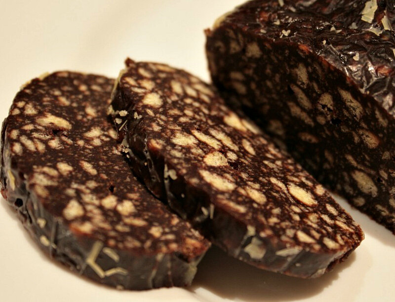 Шоколадная колбаса из печенья - незабываемый вкус детства (многие дети 80-х помнят его особенный вкус!). Помню, как мама нам с братом доверяла делать эту колбаску и мы, готовя колбаску, чувствовали себя настоящими кулинарами))). Сейчас, просматривая рецепты в интернете, очень много вариантов приготовления шоколадной колбасы: со сгущенкой, с орехами, со сметаной и даже с добавлением ирисок. А я сейчас хочу рассказать вам из чего мы готовили. Брали печенье (примерно 400 гр, может меньше), масло сливочное (1 пачка) и какао-порошок (добавляли на глазок, чтобы колбаска получилась темного цвета, как шоколадка). Какао-порошок у нас был "Золотой ярлык" (и сейчас покупаю только его). Печенье мелко ломали руками, затем добавляли туда размягченное сливочное масло, какао и потом все перемешивали руками. Полученную массу выкладывали на пакет целлофановый, придавали форму колбаски, заворачивали в пакет и в морозилку на несколько минут. Когда колбаска застывала, становилась твердой, резали на кус
