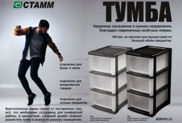 Тумба от торговой марки «СТАММ» идеально подойдет для организации рабочего пространства в офисе, а также в торговых, выставочных, складских и других помещениях. Элемент офисной мебели выполнен в современном дизайне, в классических цветовых решениях. Имеет 3 вместительных ящика с ограничителем, препятствующим их выпадению. Оснащена 4 колесиками для удобства перемещения. Материал: сертифицированный полипропилен. Габариты: 320х420х680мм. Источник - kanzoboz.ru
