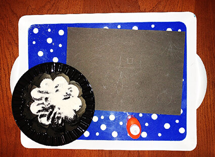 На улице все продолжает стоять мороз и падать снег. Сугробов намело.. Ого-го! Пришли с садика и решили сделать какую-нибудь поделку. Любим рисовать разными техниками. В этот раз остановились на манке. Я не очень люблю в занятиях использовать продукты. Все-таки продукты прежде всего для еды. Но иногда остается ни то, ни се.. Эти остатки уходят у нас на поделки. Это занятие интересное. Но предупреждаю сразу, достаточно много от него потом мусора. Манка легкая, постоянно норовит рассыпаться то на стол, то на пол. Да и от любого ветерка летит ) Но все же манкой получаются картины нежнее, чем от соли. Итак, вам понадобиться картон темный, манка в таре, поднос, белый карандаш, клей ПВА. Можно клеящим карандашом, но он быстро сохнет и манка хуже клеится. Карандаш белый нужен для нанесения эскиза. 1. Продумали идею. Что есть в лесу? Что хочет нарисовать ребенок? Что на небе мы сейчас видим (у нас вечер был)? 2. Дочка у меня 3-х летка, поэтому эскиз я рисовала сама