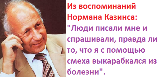 Как и обещал, знакомьтесь с интересной историей о писателе, журналисте, профессоре Нормане Казинсе, основателе нового направления в медицине - лечение смехотерапией. Друзья, многие из вас могут не поверить, но это был реальный человек, которому врачи поставили вердикт - болезнь не излечимая и вряд ли чем можно помочь. Конечно, в начале 20 столетия медицина ещё не имела таких успехов как сейчас. Однако он не согласился с таким приговором. Вопреки всем и всему, Норман Казинс выписался из клиники, поселился в отеле и полностью погрузился в мир интересного и смешного. В борьбе за выживаемость, он изо дня в день, только и делал, что смотрел комедийные фильмы и хохотал от души. Норман и сам не мог предположить, что это и было единственным средством победить серьёзный недуг. Данный прецедент дал основание учёным провести серьёзные исследования, в результате которых сделан вывод о секрете успеха "смехотерапии". Итак оказывается, что здоровый смех - это не просто естественная реакция и поведени