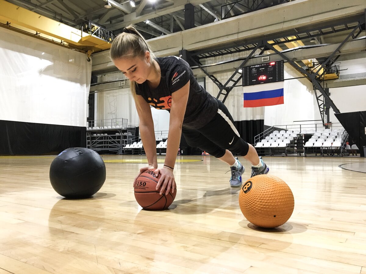 В одной из статей уже было сказано о пользе работы с собственным весом. Но чтобы тренировочная программа не стала надоедать, её можно постепенно усложнять прогрессиями упражнений. Таковыми являются отжимания на мяче. Отжимания на мяче являются очень эффективными упражнениями для укрепления трицепса, грудных мышц и сухожилий. Выполняя отжимания с мячом, вы нагружаете большее количество мышц плеча и тела за счет нестабильной точки опоры, что делает эти упражнения максимально эффективными. Как и в случае с обычными отжиманиями, существуют простые и усложненные варианты отжиманий с мячом (одна рука на мяче, две руки на мяче, смена положения рук и тела относительно мяча). Для этих отжиманий можно использовать практически любой мяч, к примеру, медбол, баскетбольный мяч или футбольный. Сложность упражнения будет зависеть от мяча, чем он твёрже, тем, соответственно, сложнее держать равновесие и отжиматься на нём. Советы: ✅ Прежде чем опустить тело, убедитесь, что руки надежно зафиксированы на