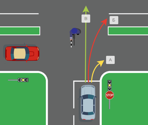 Блок вопросов о жестах регулировщика вызывает трудности не только «на бумаге», но и на практике. Для решения данной задачи требуется изучение не только жестов, но и особенностей выбранной позиции регулировщика. Условие: водитель серого автомобиля намерен продолжить движение по перекрестку с разделительной полосой. Вопрос: по каким из указанных траекторий, водителю разрешается продолжить движение? Варианты ответа: 1. Только по траектории А 2. Только по траекториям А и В 3. Только по траектории Б Решение: обратите внимание, что регулировщик находится на пересечении двух проезжих частей. Согласно требованиям правил, его сигналы будут распространяться только на первое из них. Позиция инспектора (правая рука вытянута вперед), равнозначна зеленому сигналу дополнительной секции светофора с указателем направо. Движение прямо и поворот направо на втором пересечении дорог запрещен (п. 6.10 ПДД РФ). Ответ: 1, только по траектории А. Успешно справился с задачей? Ставь палец вверх и не забывай под
