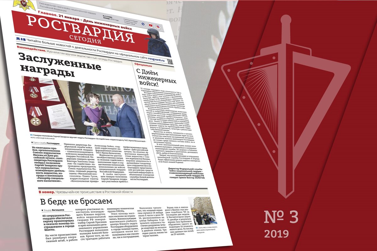 В номере: Стражи безопасности. Новые возможности Росгвардии продемонстрировали в Подмосковье. Место подвигу есть всегда. Военнослужащие Росгвардии спасли жизнь девушке. «Небо Балтики давит свинцом, держит город за горло блокада...» Почему Ленинград не мог стать «открытым городом»? Росгвардия готова обеспечить безопасность игр. В Красноярске завершается подготовка к Зимней универсиаде 2019 года. Утверждён Стандарт военной ипотеки. Условия ипотечного кредитования в 2019 году. Знакомство с Росгвардией. Турецкая делегация посетила Центральный музей. Подписаться на газету можно в любом отделении Почты России. Индекс издания по каталогу Роспечати: 50157