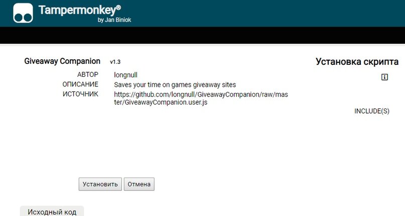 Мы не будем писать долгое вступление, вы и сами знаете, зачем вам это нужно. Ниже мы приведём вам инструкцию о том, автоматизировать процес получения игр. Мы будем использовать расширение Tampermonkey. Оно позволит нам использовать готовые скрипты для сайтов. Ссылка на приложение в магазине расширения Chrome: Ссылка chrome.google.com/webstore/detail/tampermonkey/dhdgffkkebhmkfjojejmpbldmpobfkfo Для других браузеров скачивайте по ссылке, либо ищете для своего браузера индивидуально. 1)Скачиваем расширение с маркета (установить). Даем разрешения дополнению. 2)После установки и первой настройки приложения. Нужно установить необходимый нам скрипт, который и будет выполнять за нас большинство заданий. Для этого, нужно лишь перейти по ссылке: https://raw.githubusercontent.com/longnull/GiveawayCompanion/master/GiveawayCompanion.user.js и если у вас установлен плагин, то достаточно будет нажать лишь кнопку установить. П Проверка работоспособности: 3)Если скрипт встал правильно, то можно начи