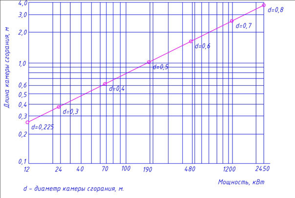 К примеру, диаметр и длина топки котла должна быть не менее указанных в графике каталога «Теплотехническое и отопительное оборудование» (библиотека «Аква-Терм») под редакцией академика С. Е. Беликова. Фотографии данного графика прилагаем ниже к данной статье.