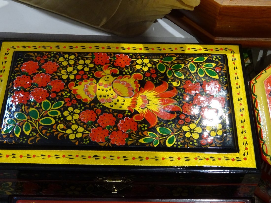 Художественная роспись шкатулок на протяжении веков пользовалась особой популярностью в регионах России, немало сохранилось и техник нанесения рисунков. Например, «пламенную хохлому» знают повсюду и сегодня, все эти деревянные шкатулки, ложки, чашки, тарелки и многое другое. Этот традиционный русский промысел возник ещё в середине XVII века. А своё название получил от крупного торгового села Хохлома (Нижегородской губернии), в которое из близлежащих деревень свозили деревянные изделия на продажу. Для такой росписи была характерна оригинальная техника окраски дерева в золотистый цвет. В основном использовались: красный, черный и золотой цвет, редко зелёный и жёлтый. Подробнее процесс росписи шкатулки можно увидеть на видео. Этот узор называется смородинка. Но популярной яркая роспись "под фон" стала только во второй половине XIX века, когда было налажено и мебельное производство. В наши дни на шкатулках можно встретить самые разные техники художественной росписи. А вот изображения, как