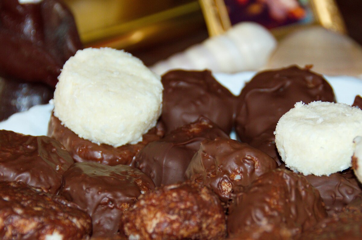 Пока шоколад плавится смешиваем кокосовую стружку со сгущенным молоком, лепим конфетки любой формы, укладываем на блюдо с пищевой пленкой, ставим в морозилку на 15-20 минут.