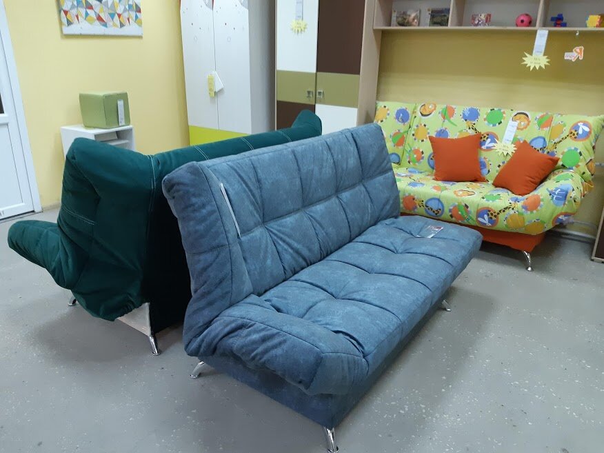 Третье скопление. Диваны типа "Клик-Кляк-3". В комплекте к дивану прилагается кресло и пуфик, но можно купить и по отдельности. Цена без дополнительных предметов от 18 до 19 тыс. руб. Размер в разобранном состоянии 1300х2000. Ножки металлические.