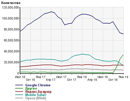 На российском рынке появился таинственный браузер, который в октябре 2018 года стартовал так, что обогнал даже Яндекс браузер и Мобильный Сафари (работает на всех устройствах Apple). Это следует из данных статики liveinternet Обратите внимание на графике на пункт "Другие". Обычно туда включаются самые непопулярные браузеры России. Однако в октябре ситуация изменилась и появился какой-то новый не определяемый браузер, который автоматом попал в раздел "Другие".Пока не удалось выяснить кто это, но интригует. Хотя есть подозрение, что Liveinternet мог поменять свои алгоритмы и начал учитывать внутренние открытия ссылок внутри сервиса, типа Одноалкассников или ВКонтакте или другой соцсети.