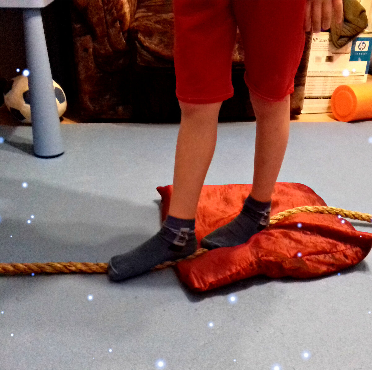 * проложите канат по сиденью стула, чтобы ребёнок "карабкался в гору" и спускался с неё.