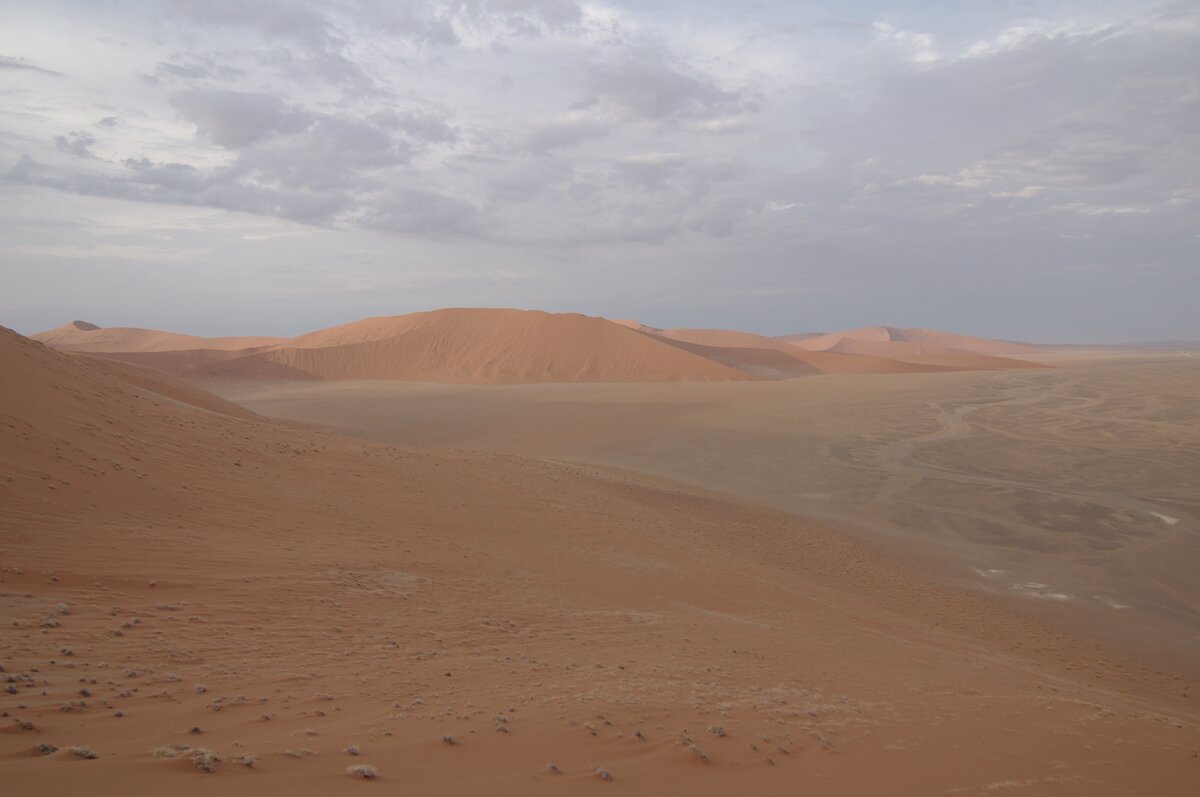 Я люблю пустыню. Но Намиб — это пустыня особенная. И не только потому, что дала название целой стране — Намибии. Название пустыни и страны происходит из языка коренной народности нама — "место, где ничего нет". Намибия — древнейшая в мире пустыня. Она появилась 80 миллионов лет назад, когда ещё динозавры были. И если вы в Намибии, то сможете пешком, вот прямо своими ногами, взойти на самую высокую дюну в мире. Обычно это запрещено, потому что люди своими восхождениями разрушают дюны. У этой дюны есть название, вернее номер — дюна №7. Если будет хоть немного облачно, то вы сможете идти даже босиком. Нам повезло. Вчера было солнце и без трекинговых ботинок было уже не дойти. Наверное, фото не передаёт, что мы сейчас на высоте 383 м. 127 этажей представили? Любуемся на песок. Не удержались и немного насыпали с собой в пустую бутылку в качестве сувенира. Несмотря на облака, жарища ещё та. Обратно идти лень. А зачем идти? Ииии, покатились вниз. По шею тут не окунуться. Главное, в на