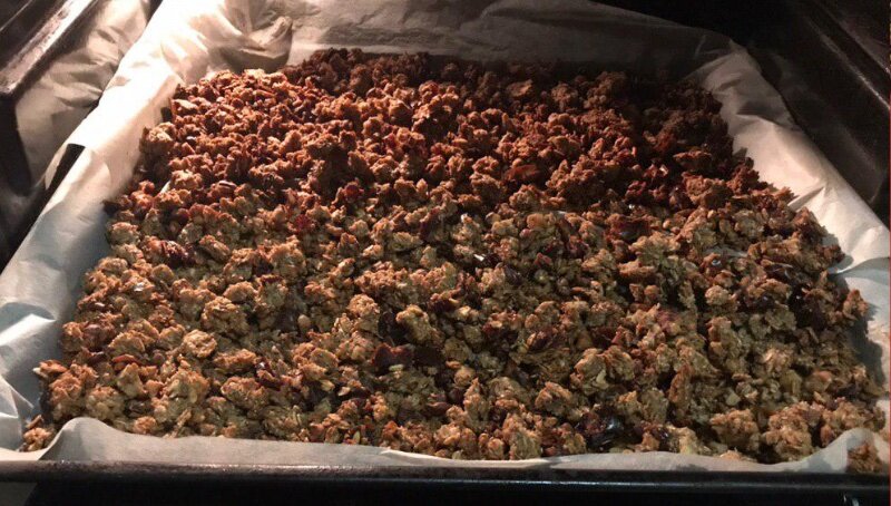 Гранола - традиционный завтрак родом из США. Гранола содержит в себе плющеную овсяные хлопья, орехи и мед, которые запекаются до хрустящего состояния. Состав домашней гранолы: Овсяные хлопья - 750 гр. Вода - 1,5 стакана (Кипяток). Мед - 5 столовых ложек. Кокосовая стружка - 3 столовые ложки. Финики -200 гр. (По желанию) Грецкие орехи - 200 гр. Корица - 1 столовая ложка. Приготовление: