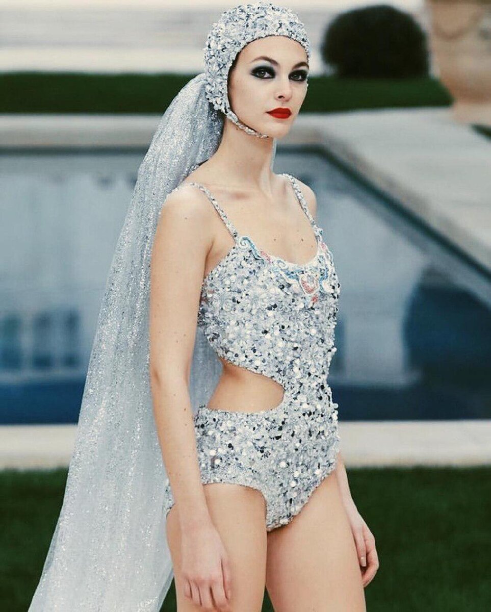 Из года в год дизайнеры пытаются перещеголять друг друга, воплощая свои безумные идеи в реальность. В этот раз постарался Карл Лагерфельд. На показе Chanel Haute Couture Spring 2019 модель Виттория Черетти вышла на подиум в свадебном купальнике, украшенном пайетками. Фата крепилась к купальной шапочке, выполненной из идентичного материала. Модные издания по всему миру уже успели похвалить Карла Лагерфельда за его смелость и за прекрасный наряд для свадьбы на пляже. Что думаете Вы?