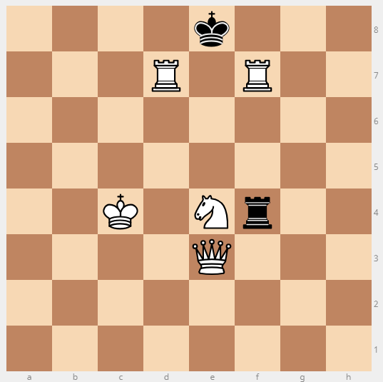 Шахматная задача. Черные легко отдают ладью, брать ее нельзя - пат (ничья). Белые начинают и ставят мат в 2 хода. Подпишитесь на канал и будет много новых, интересных, познавательных задач. Решение публикую далее 1. Ферз f3. 1. ... брать ферзя нельзя из-за мата конем на d6. Черные могут отойти ладьей на h4. 2. Ладья f на e7 мат. Подпишитесь на канал и будет еще много новых, интересных, познавательных задач. Задача 7 тут >>>