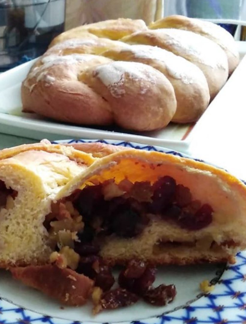 Традиционное австрийское рождественское блюдо "штрицель" . Это плетёный кекс. Продавалось на рождественской ярмарке. Предлагаю очень простой кекс. Лёгкий в приготовлении. А к чаю самое оно. Ингредиенты: 600 грамм муки 500 грамм молока 1 столовая ложка дрожжей 1 штука яйца 200 грамм сливочного масла 1 столовая ложка сахара 100 грамм изюма 100 грамм манки Алгоритм приготовления: В глубокой чаше 1 столовую ложку дрожжей разводим 250 граммами молока. Туда же добавляем 100 грамм мягкого сливочного масла. Разбиваем 1 яйцо. Постепенно добавляем 600 грами муки. Замешиваем тесто. Оставим подниматься на 2 - 3 часа. Небольшую кастрюлю ставим на медленный огонь. Наливаем 1 стакан молока. Как начнёт закипать, ещё убавляем огонь. И сразу аккуратно засыпаем 100 грамм манки. Помешиваем, чтобы не было комочков. Туда же ложим 50 грамм сливочного масла. Перемешиваем. Как масло растопится. Снимаем с огня. Моем изюм. Заливаем кашей. Готовое тесто делим на 3 част