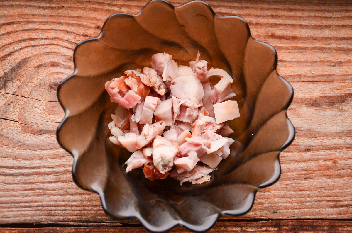 Для "сборки" салата Невеста с копченой птицей подготовьте 220 г непосредственно самой курицы, один плавленый сырок (лучше не экономить), пару картофелин, один лук-шалот (он сладковатый), пару свежайших куриных яиц и несколько веточек любой зелени. Картофель и яйца нужно отварить и бросить в ледяную воду потом. Копченый куриный окорок разберите на кусочки, отбросив в сторону косточки и кожу.