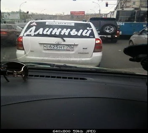 Позитив на выходные! По пути на работу можно не только попасть в пробку, но и зарядиться позитивом! Откуда его взять? Просто взгляните на эти надписи на заднем стекле автомобиля и отличное настроение на ближайшую неделю вам обеспечено! 1. Как думаете, чем можно измерить мужика? Как выявить, настоящий он или нет. Владелец этого белого авто предложил свой вариант трактовки. 2. Это типа он говорит "Попробуй обогнать" или просто нарывается? 3. А это, видимо, другой вариант. Берегись! В этом авто едет полтергейст. Только нос у него странный, не находите? 4. Ну, что? Ждем? - а на что вам намекает взгляд этого песика? 5. Я силач. Только не обгоняйте, пожалуйста. 6. Грамотный водитель. По крайней мере, ПДД знает точно! 7. Чтобы он не сказал - Останови, я выйду. 8. Это точно! Тем, кто мастерски объезжает ямы, автодром в ГИБДД пройти вообще не проблема! 9. Посмотрите на этот взгляд. Разве можно ему не доверять? 10. Правда жизни. Даже добавить нечего 11. Если куда-нибудь идти, то "куда-нибуд