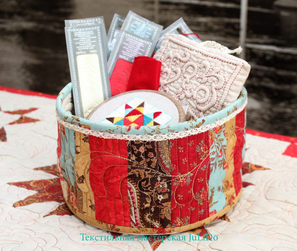Сегодня буду делиться с вами мастер-классом по изготовлению милой текстильной корзиночки. Сложно не будет, с изготовлением сможет справится каждый! Ну что, отправляемся шить?! Для изготовления корзинки нам нужно совсем немного: 1. Полоски ткани длиной 10-15 см (это зависит от высоты вашей будущей корзинки, у меня 13 см) разной ширины, сочетающиеся между собой по стилю и цвету. Эту подборку я делала сама, в ней перемешаны ткани из разных коллекций, разных производителей. И еще полоски для окантовки. 2. Ткань для дна — два квадрата (или один прямоугольник, сложенный пополам), размер квадратов должен быть таким, чтобы на них уместился круг, задуманного диаметра. В моем случае D=20см +10-15% на усадку при стежке. Заранее готовим шаблон. Радиус круга — 10см. 3. Ткань для боковой части корзины, ее размер высчитываем по формуле периметра окружности: p = 2πr, где π=3,14 r (в моем случае) =10см. Тогда p=2*3,14*10=62,83. Я беру ткань шириной 13 см и длиной 70 см. 4. Дублирин для дна, самый жестк