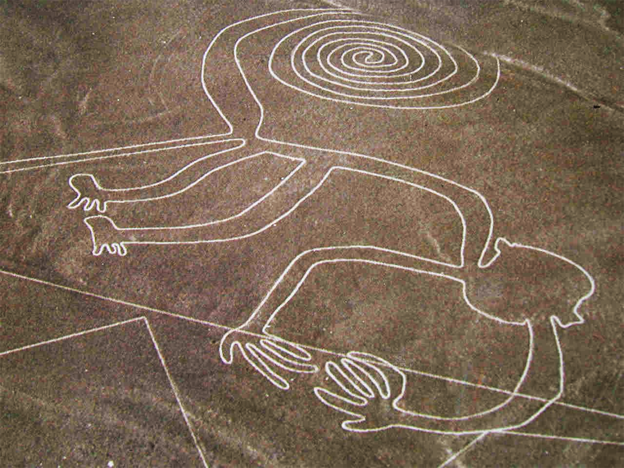 Если по Панамериканскому шоссе отъехать на 400 километров к югу от Лимы, то на обочине увидишь табличку. Из надписи на ней точно узнаешь. что находишься в пределах таинственного мира линий Наски. Однако сразу ничего не заметишь. Кругом унылая равнина, как называют ее местные жители - пампа, пыль и россыпи небольших камней. Даже с 15-метровой вышки увидишь разве что несколько неясных, уходящих к горизонту линий. Мир узнал о загадочных изображениях сравнительно недавно, в то время, когда стало возможно исследовать поверхность земли с помощью авиации. Ведь для того, чтобы увидеть рисунки необходимо подняться на высоту 1000 с лишним метров. Впервые на линии обратили внимание в 30-х годах 20-го века, когда впервые делали аэрофотосъемку пустыни Наска. Многокилометровые, прямые как стрелы линии пересекали пустыню в разных направлениях. Сегодня уже подсчитано - этих линий больше 13 000. А кроме этого здесь же обнаружено 788 гигантских фигур - как абстрактных, так и изображающих птиц и звере