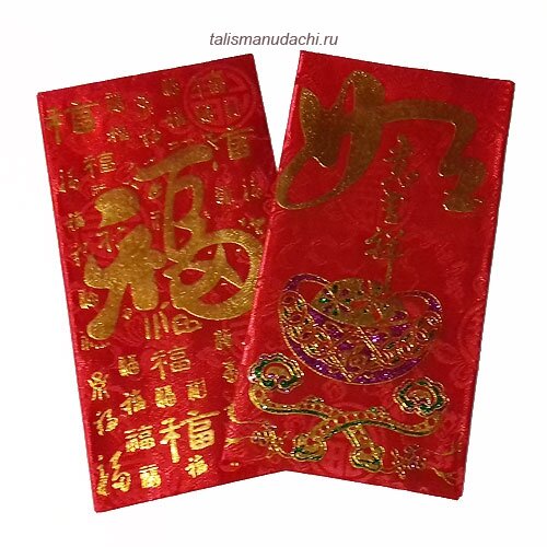 Широко используется в практике фэн-шуй для привлечения богатства и материального благополучия. Храните деньги в этом конверте, чтобы процветание и благополучие не покидали вас. Красный Фэн-Шуй конверт — самый популярный и действенный талисман, привлекающий деньги. Считается, что хранение денег в красном конверте приносит его владельцу достаток, финансовое процветание и помогает реализовывать мечты. На Руси деньги также хранили и носили с собой на поясе в красных сумках/мешочках. Денежный красный конверт — символ материального успеха и богатства, является благоприятным подарком для родных и близких в дни бракосочетания, дни рождения, на Новый Год и семейные праздники. Даря деньги в красном конверте, тем самым, вы желаете человеку обеспеченной жизни, процветания, счастья и крепкого здоровья. Помните, что финансовое благополучие приходит и к тем, кто дарит деньги в красном конверте, и к тем, кто их принимает! Чем больше вы дарите, тем больше к вам возвращается! Красный конверт, помимо св
