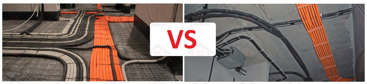 Как лучше вести трассировку кабеля, по полу или потолку. В нормативных документах нет запрещения того или иного вида прокладки проводов. Поэтому скорее всего это вопрос удобства, субъективных мнений и экономики ремонта. В каких случаях удобней делать электрику по потолку. 1. Когда заказчик планирует натяжные потолки. Благодаря которым можно спрятать гофры, которые будут установлены по потолку. 2. Когда заказчик планирует установить гипсокартонные потолки. Причем не обязательно делать весь потолок из гипсокартона. Его можно сделать локально или по периметру помещений. 3. Когда в квартире уже залита стяжка от застройщика и нет смысла переделывать слой и тратить на это деньги. 4. Встречаются заказчики, которые не хотят переделывать напольные покрытия. Особенно когда речь идет о дорогом покрытии. Когда необходимо сделать ремонт, исключая замену пола. И в этом варианте единственно правильным решением вести электрику по потолку. Трассировка кабелей по полу Такие работы проводятся в дв