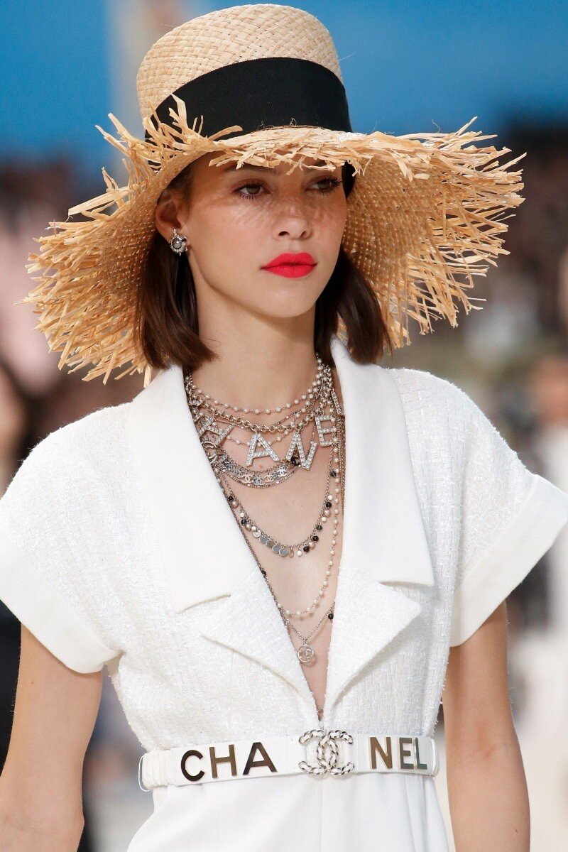 Для тех, кто пропустил - это продолжение ВОТ ЭТОЙ СТАТЬИ (стоит сначала с ней ознакомиться ~) 6. Логомания Идея носить названия и логотипы брендов нарочито заметным образом периодически посещает дизайнеров. Не обошел этот тренд и модные украшения 2019. Особенно подвержен ему бренд Chanel, но и другие не отстают: серьги, колье, браслеты и пояса пестрят крупными надписями. Однако надо понимать, что хорошо это смотрится только в оригинальных украшениях. Если вы не можете позволить себе оригинал Chanel, не надо покупать копию. Ничего никому этим не докажете: близкие хорошо вас знают, а обладатели оригиналов отличат подделку. Да и быть добровольным рекламным щитом бренда – сомнительная перспектива. 7. Заколки и гребешки Тренд сформировался в 2018 году, но перешел и в 2019. Поэтому смело украшайте прическу разнообразными заколками. В моде все: жемчуг, пластик, металл, стразы, растительные мотивы. Даже обычнейшие невидимки могут стать интересным акцентом, если надеть сразу несколько штук. А