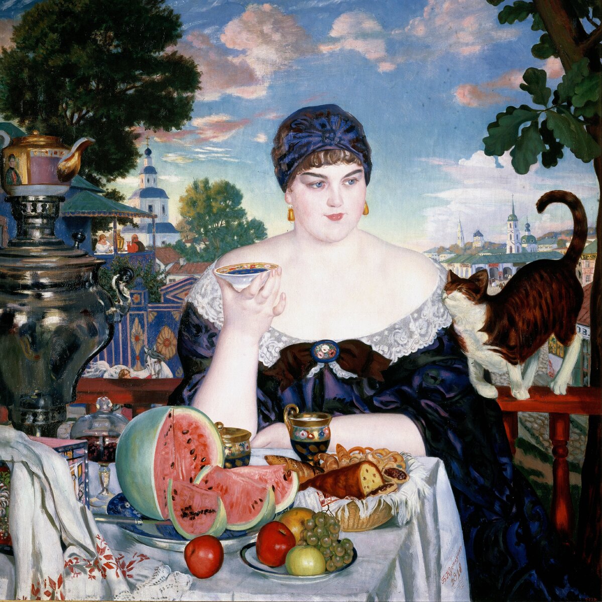 Кто не знает эту прекрасную картину Кустодиева! "Купчиха за чаем". Великолепный натюрморт на столе, пышнотелая красавица с открытыми плечами, умильный кот, ластящийся к ней - яркое, мажорное зрелище, воспевающее полноту бытия и безмятежность стабильного существования. Трудно поверить, что картина писалась в отнюдь не сытом и уж совсем не спокойном 1918 году тяжело больным художником... Удивительно, как прекрасен был его внутренний мир, как он умел излучать радость, даже находясь в невеселой ситуации. Ведь он писал картину, сидя в инвалидном кресле. Но какова живопись! Какова точность рисунка! Тема купеческой жизни давно интересовала Кустодиева. Он написал несколько картин, посвященных купцам и купчихам, особенно его привлекал тип обильной телом женщины. Вот его купчиха 1915 года, например: Но вернемся к нашей героине. Кто же позировал для нее? Когда художник задумал свою картину, он еще не знал, с кого писать центрального персонажа. Начал сперва делать фон. Жена Кустодиева обратила вн