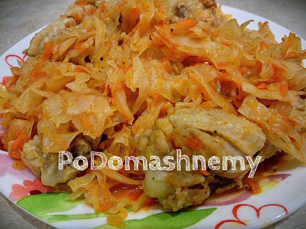 - 2 ст.л. растительного масла. Способ приготовления: Курицу помойте и порежьте порционными кусочками. У меня было 4 крылышка, я их порезала на три части. Лук нарежьте кубиками. Морковь натрите на мелкой терке. Нашинкуйте капусту. Смажьте чашу мультиварки растительным маслом. На дно разложите курицу, затем добавьте лук и морковь, капусту. Посолите, поперчите, добавьте лавровый лист и кетчуп (его можно заменить томатным соусом). Мультиварку включите в режиме «Тушить» на 40 минут, затем переключите на режим «Жарить» на 20 минут. После, перемешайте капусту с мясом и постав