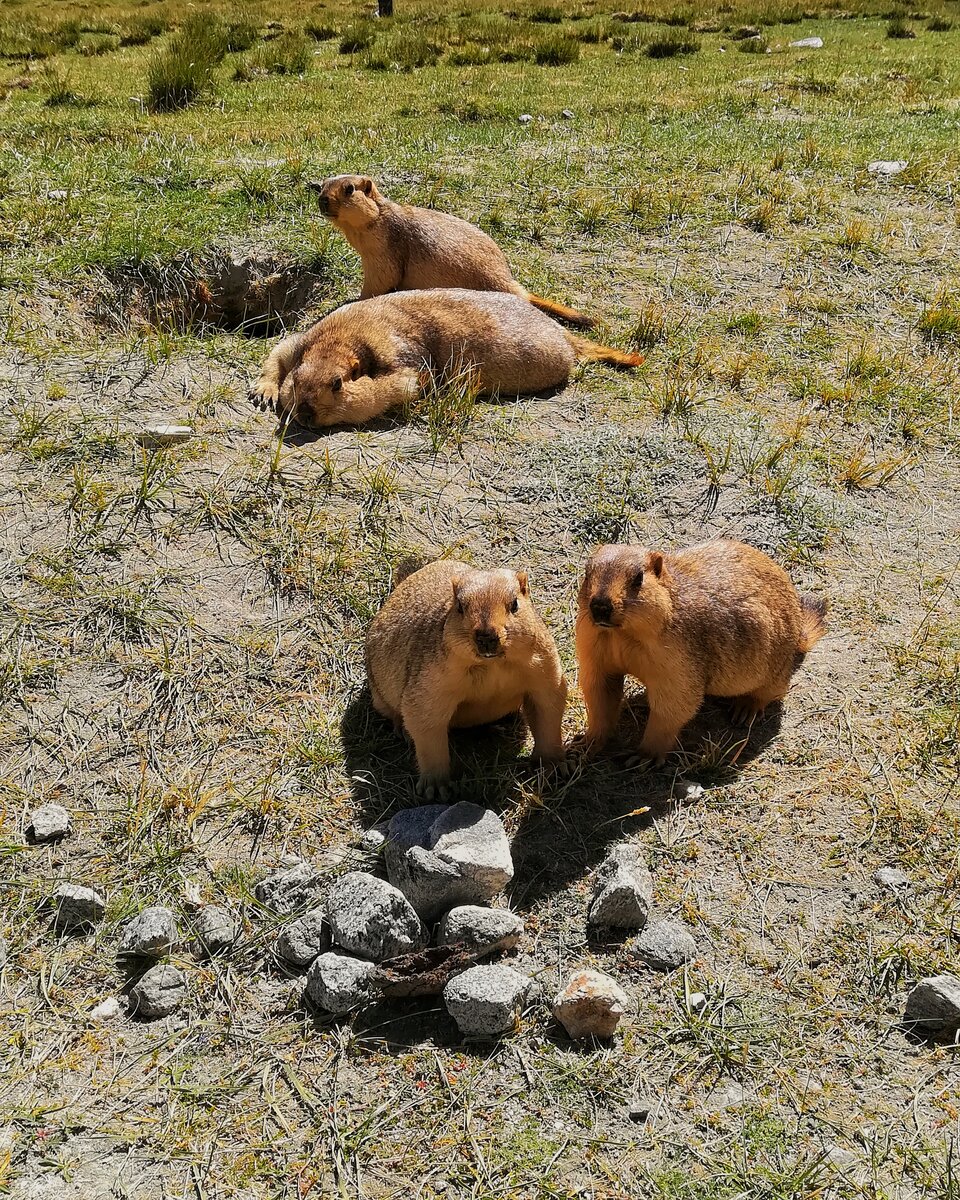 Пангонг стал самой дальней точкой нашего маршрута. Настала пора возвращаться обратно. Едва отъехав от озера, мы увидели у обочины группу японских туристов, что-то фотографирующих в поле. Тормозим. Все поле было усыпано греющимися на солнце гималайскими сурками. Упитанные, с лоснящимися на солнце шкурками, они совсем не боялись присутствия людей. Мы поманили их к себе, и самые смелые (или самые голодные) из них подбежали к нам, требуя лакомство. Все в плюсе: туристы получают фото, сурки - пропитание. Я ехал и мысленно прощался с Гималаями, прокручивая в голове увиденные пейзажи. Горы, словно помогая мне, старались продемонстрировать напоследок все самое яркое и интересное: снежные вершины, горных яков, извилистые реки, бурные водопады. Горы шептали: - Не торопитесь, погостите ещё. Сначала мы потеряли одного из участников. Еще та оказалась задача найти друг друга, не имея никакой связи. Телефонной сети нет, гарнитуры не работают... Потом на мотоцикле пробило колесо. Почти два часа