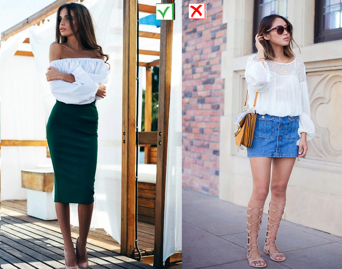 С помощью этих трюков вы сможете зрительно удлинить ноги и выглядеть элегантно. 1. Высокая талия Почему-то многие думаю, что мини-юбка и высокий каблук помогут зрительно вытянуть ноги, но к сожалению, при этом девушки выглядят несуразно и неслаженно. Завышенная талия на юбках и брюках создает впечатление, что ноги начинаются выше. 2. Подбирайте обувь в тон Обувь подобранная под цвет наряда или тона кожи так же зрительно удлиняет ноги, так как создается видимость единой линии. 3. Избегайте длинных топов, блуз и свитеров Такая одежда зрительно удлиняет туловище, от чего ноги кажутся короткими. Заправляйте длинные кофты и укорачивайте топы. 4. Минимум деталей Старайтесь избегать плиссировки, объемных карманов, подворотов и других деталей. Умеренный силуэт удлиняет ноги. 5. Длина Следите за длиной юбки или платья. Длина может быть любой, но если изделие будет заканчива