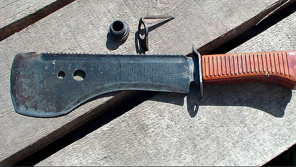Этот "монстр" может наверное всё. Собственно в то время, на заводах Советского Союза, производили что только можно, лишь бы обеспечить людей всем необходимым. Коснулось это также и силовых структур государства. И сегодня хотелось бы поговорить об одной такой вещице, годной "на все случаи жизни" - будь то оружие или подручный инструмент, и имя ему "Тайга-1", память о котором живет не только в нашей стране, но и за рубежом. Описание Как я и написал выше, "Тайга" может всё. Пилить, рубить, перекусывать, ковырять, и все то, что вы еще сможете придумать. Даже на сегодняшний день будет весьма сложно найти такой нож или же мачете, который одинаково хорошо справлялся бы с каждой из таких вот поставленных перед ним задач. Чего уж говорить - пехотная лопатка и та проигрывает "Тайге". И это со всей её универсальностью и неприхотливостью. Клинок у него прямой и длинный - 212 мм. Общая длина составляет 347 мм (с рукоятью вместе). Максимальная ширина 80 мм. Такая его особенность делает из него прочн