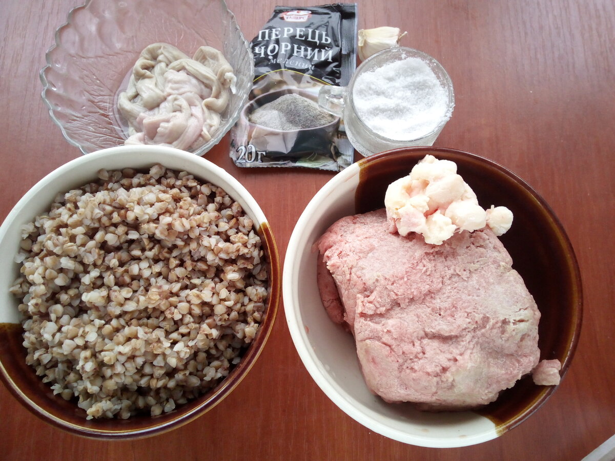 1. Свиные кишки хорошо промойте и оставьте в воде с уксусом, пока будете готовить начинку.